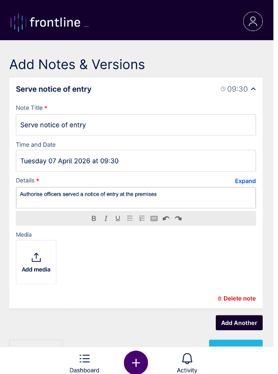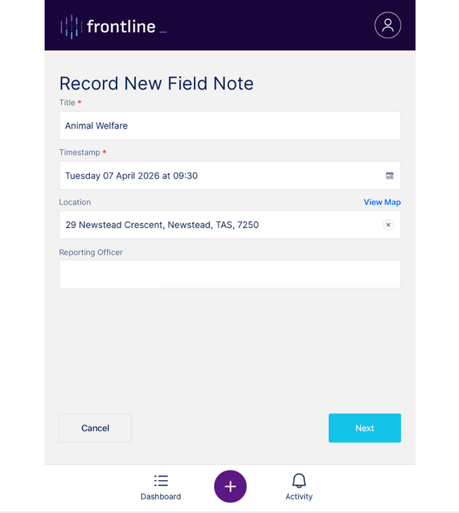 At the bottom of this screen is the Frontline toolbar. This toolbar is always visible and can be accessed at any time. It contains three buttons: the Dashboard button, the New Field Note button, and the Activity button.