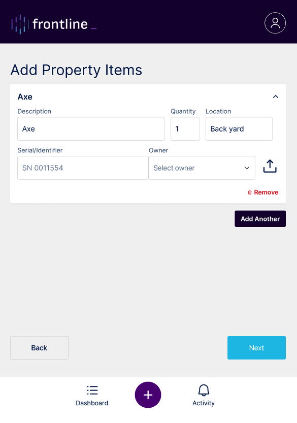 Enter details such as Description, Quantity, Location, Serial/Identifier, and Owner (all fields are optional).