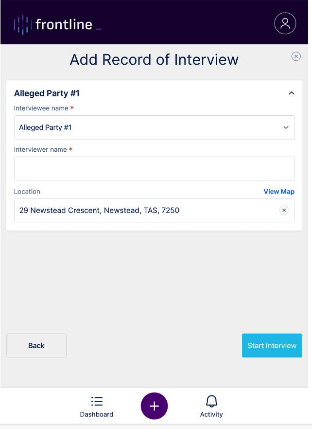 Confirm or edit the Interviewer Name, which is automatically populated with the user’s name.