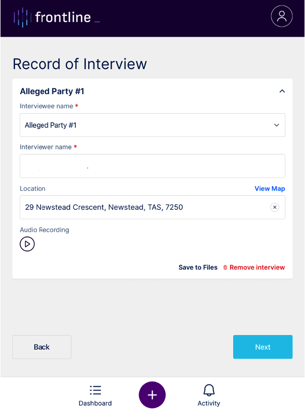 The Interview tool is used to record audio of witness statements related to a field note.