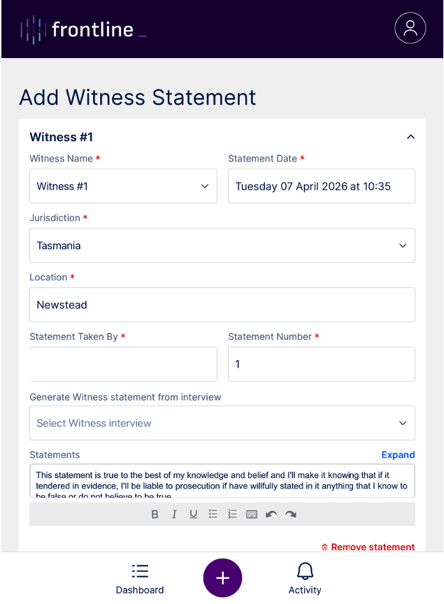 The Witness Statement tool is used to record formal written statements linked to a field note.