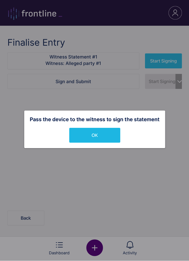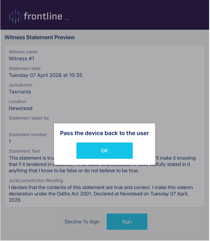 Once the witness has signed the statement a message appears to pass the device back to the user.