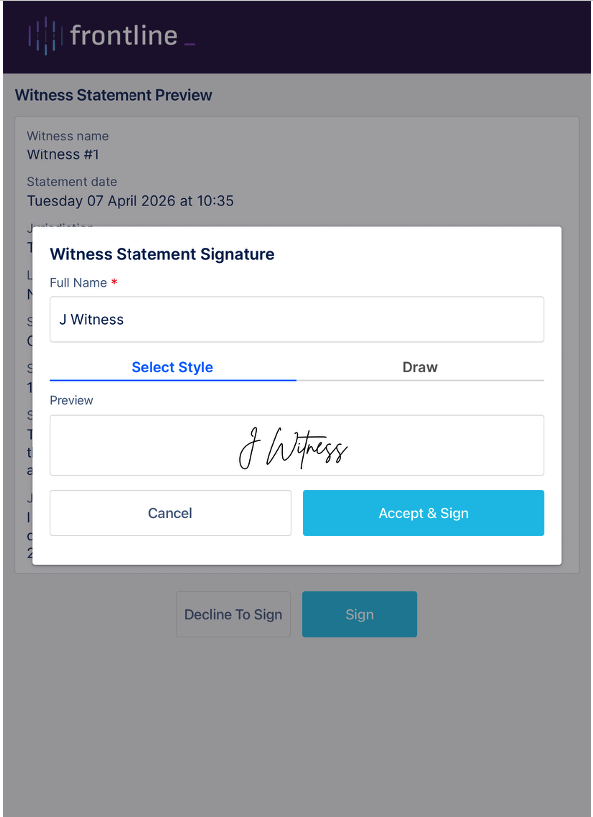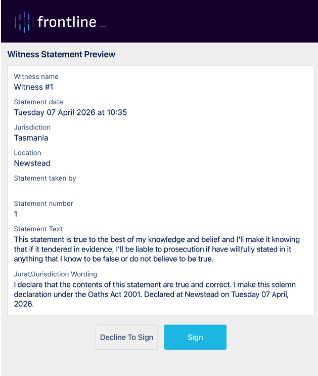 Note: The witness statements can be signed by involved parties remotely using any available device that has access to a Wi-Fi connection. Remote signing can still occur even if there is no connectivity. The note will finish finalising when connectivity has been re-established.