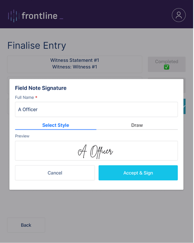 Once the witness statement has been signed, the user signs the field note using the same signing process.