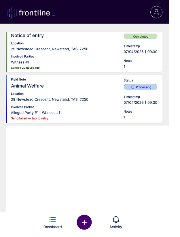 This guide provides a complete overview of how to use the Comtrac Frontline Mobile App to capture, manage, and finalise field notes in a structured and secure way. By following the steps outlined, users can ensure that all information is recorded accurately, supporting a clear and defensible investigation process. The application is designed to streamline field workflows while maintaining data integrity, auditability, and compliance requirements. Users should ensure all relevant forms are completed and signed before submission to avoid delays or incomplete records. For further support, refer to the Support team or contact your organisation’s Comtrac administrator.