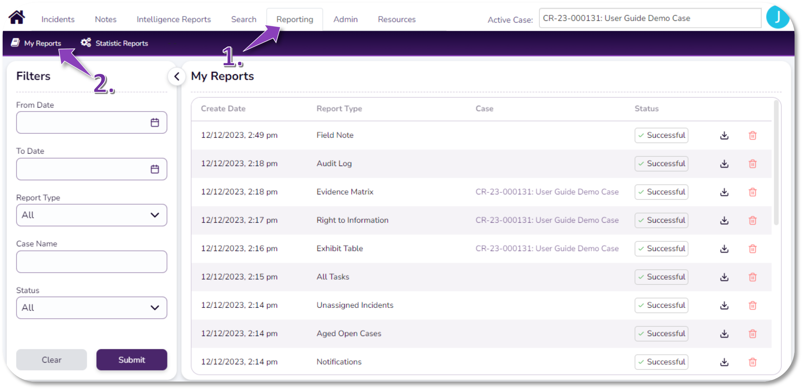 Once a report has been exported, it can be downloaded in the new My Reports page, which is a centralised repository where all reports historically generated across Comtrac by the signed in user can be downloaded. This table can be further filtered, and the status of currently exporting reports can also be viewed on this page.