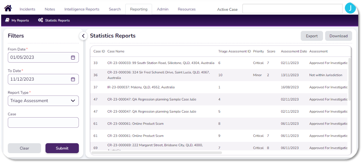 The new Statistics Reports function in Comtrac allows users to easily generate reports against entity, incident and investigation related data in the Comtrac database. Reports can be exported and downloaded in .csv format for further data analysis.