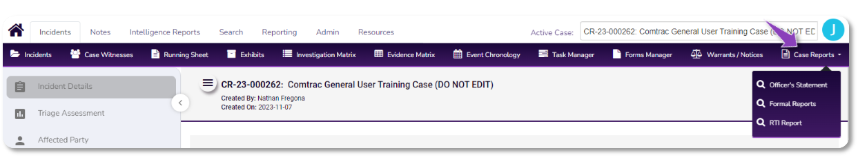This includes Case Reports (Officer's Statement, Formal Reports & RTI Reports) which can now be found in the purple Investigation Management ribbon within a case.