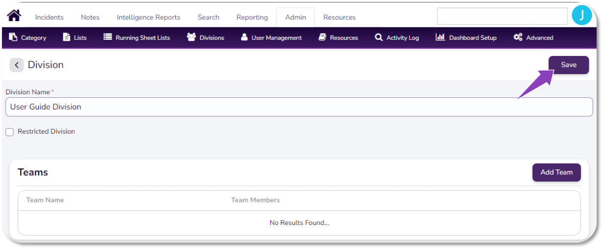 System Administrators can create and update Divisions/Teams in the new Divisions page, and a Division must be assigned in the Incident Details Page before Officers can be assigned when creating a case.