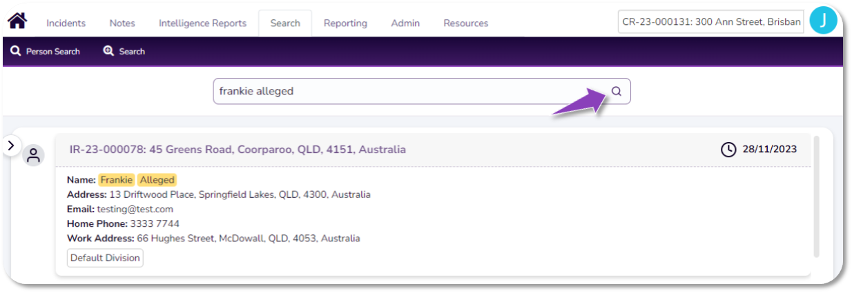 Intelligent Search and Location Search have been removed and replaced with an all-new Search function in Comtrac. This allows a user to search incident and case-related data they have access to, including person & contact information, running sheet notes, properties, exhibits (from cases the user is assigned to) as well as file contents for text document exhibits.