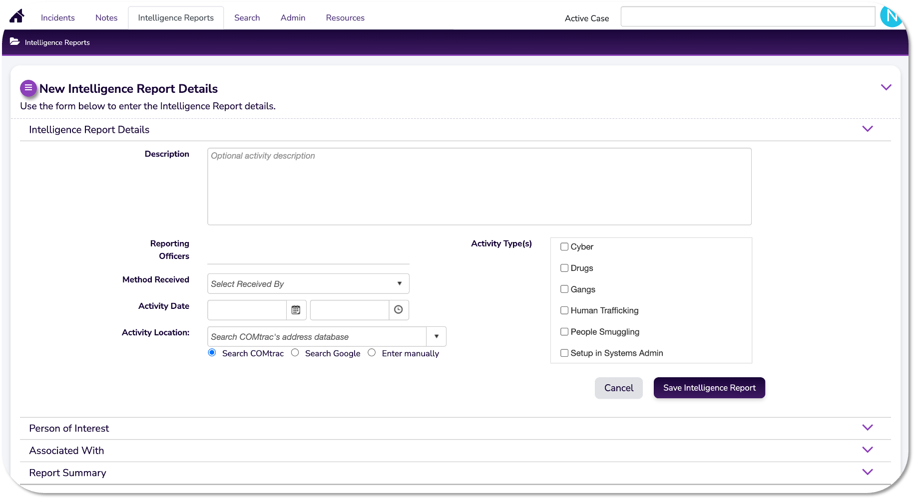 The Intelligence Reports guides relate to the below section in Comtrac. Your exact layout may differ depending on your organisation / agencies screen text, configuration and Comtrac version.