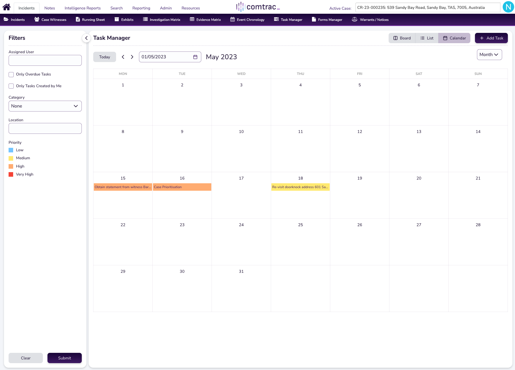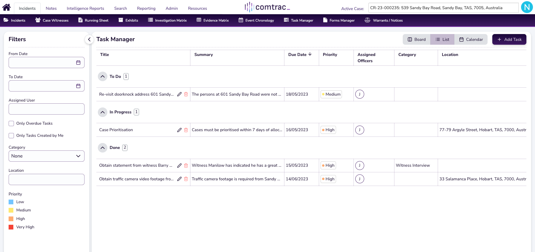 🔍 Incidents > Incidents (purple ribbon) > Select Existing Assigned Case > Task Manager > Select 'Board', 'List', or 'Calendar' views