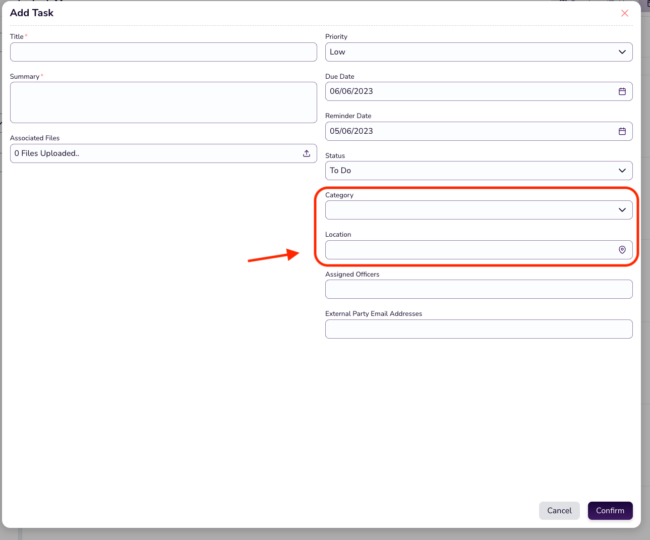 Category and Location are new task fields which can be completed for each task created within a case.