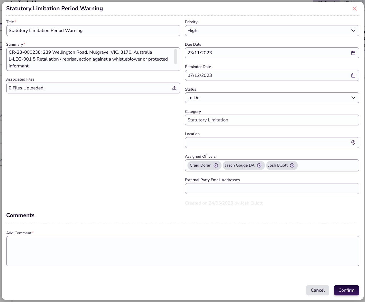 Once this is set up, a Statutory Limitation Period Warning Task (see below) is created for assigned officers to the case, with the due date set to 6 months before the end of the statutory limitation period, and a reminder 14 days after that. Both these dates can be modified in the task itself to suit your business processes.