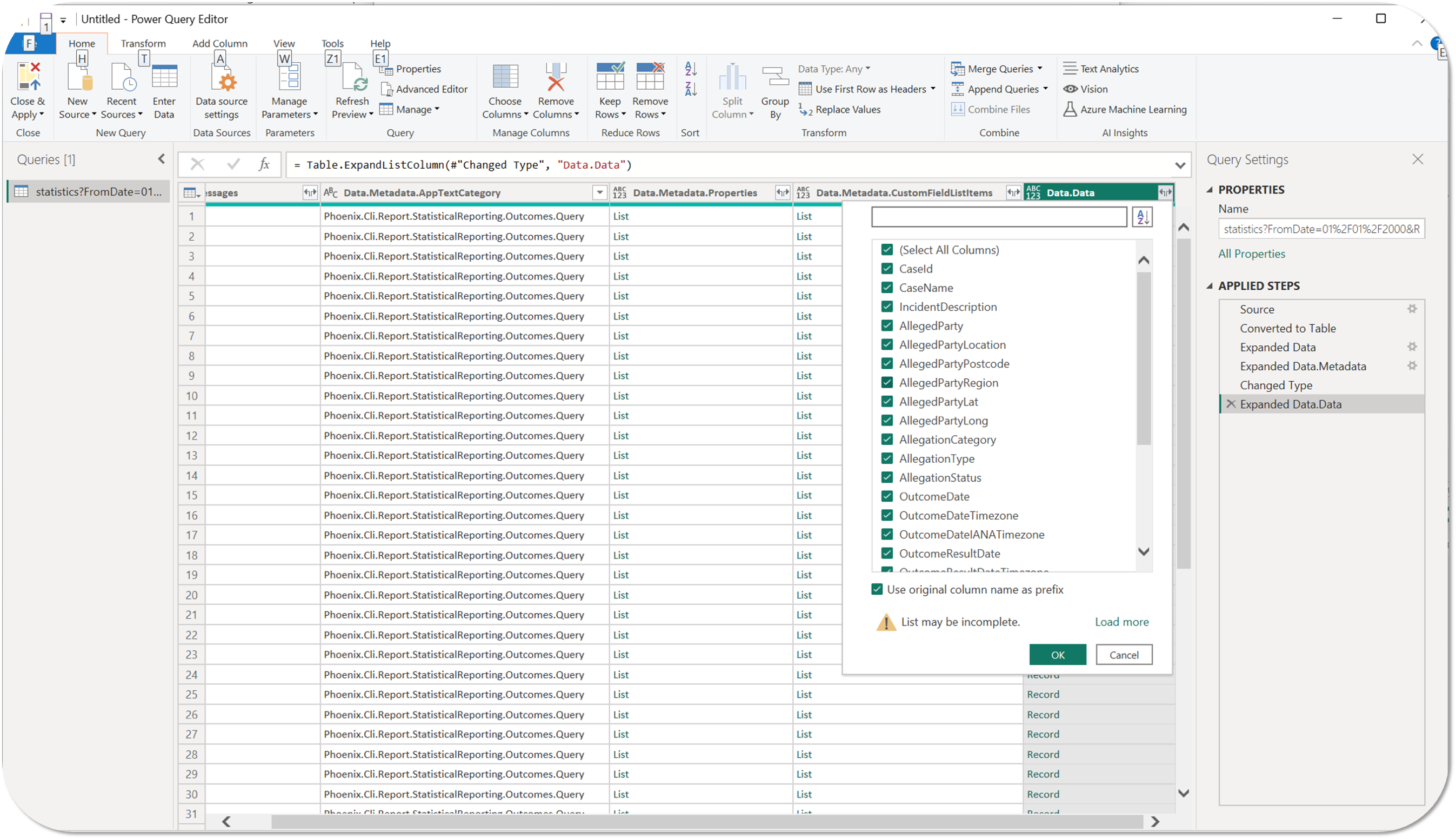 - NOTE: Uncheck 'Use original column name as prefix' if you don't want 'Data.Data' to appear before each column name, e.g. 'Data.Data.CaseId' becomes just 'CaseId'.