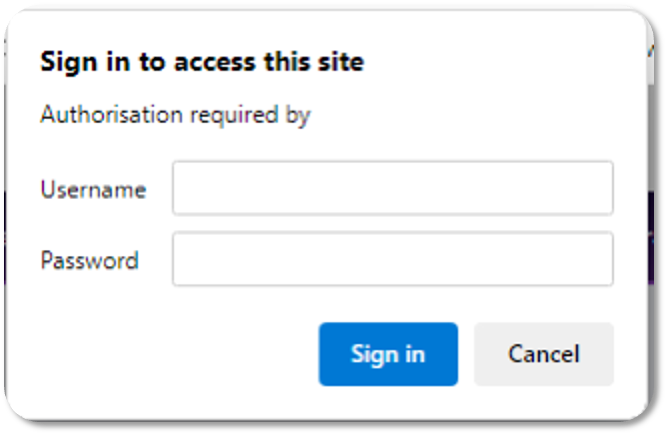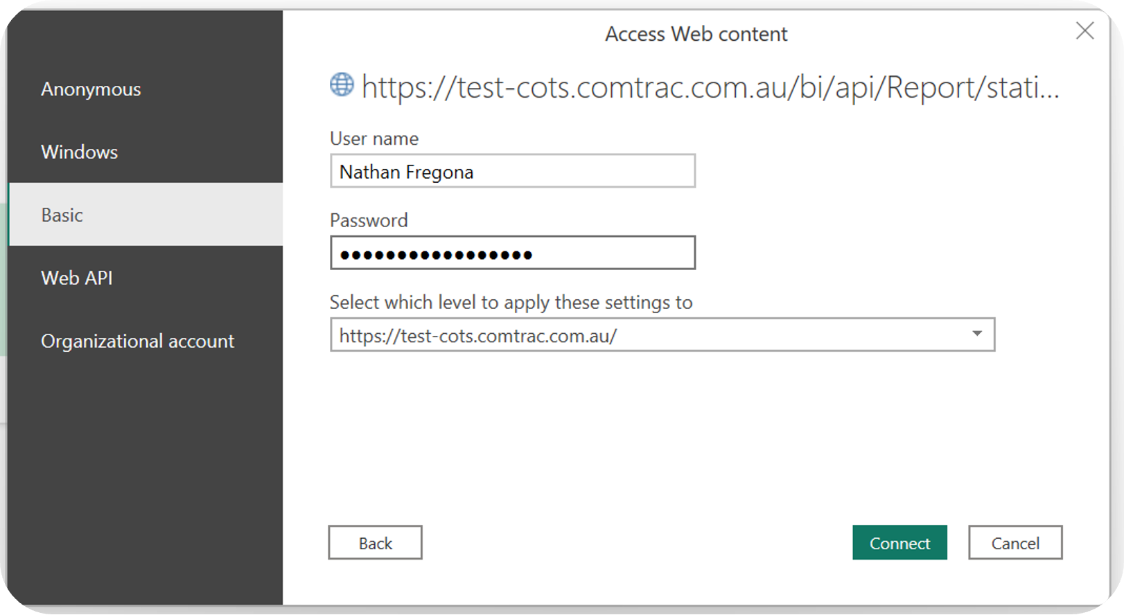 - From the Access Web Content pop-up that appears, navigate to Basic and enter in your Comtrac Username and Password. See the example user below: