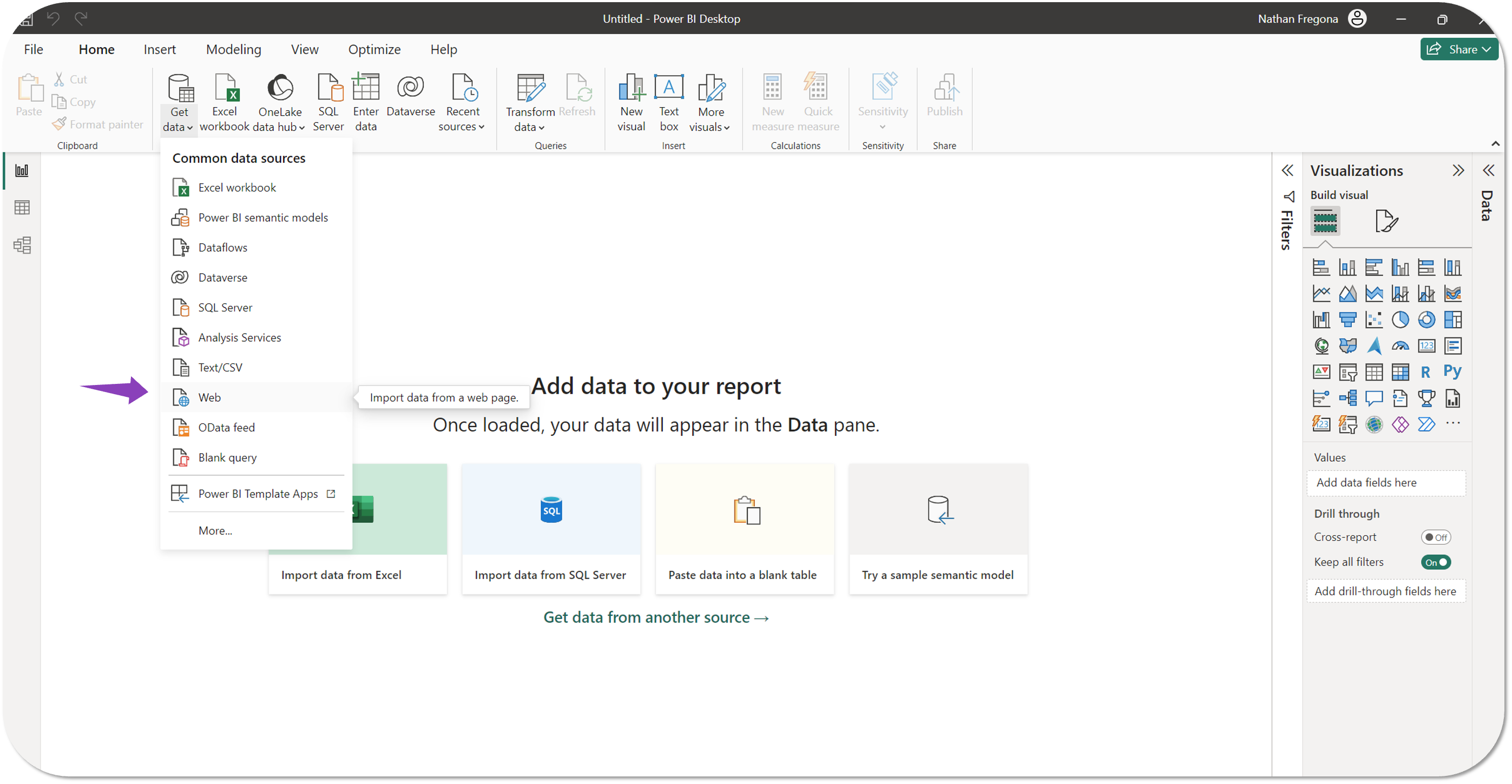 - From the new report, select Get Data > Web.