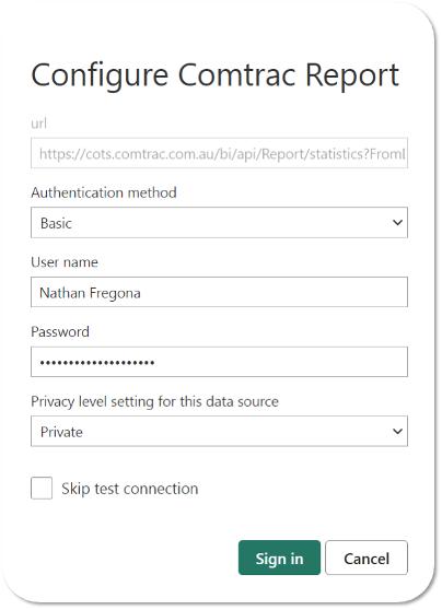 - More than 999999999 records: If you're unsure if the API URL has more than 999999999 records associated, try adding PageIndex=1 into the URL and pasting it into your browser (e.g. https://test-cots.comtrac.com.au/bi/api/Report/statistics?FromDate=01%2F01%2F2023&ReportType=204&PageIndex=1&PageSize=999999999). If records are returned, you may also want to add this additional API URL into your Power BI reports to ensure data isn't excluded.