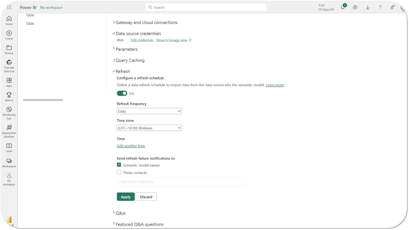 - Toggle the refresh scheduler ON and choose your refresh frequency (daily or weekly), time zone etc. and then Apply to set the schedule.