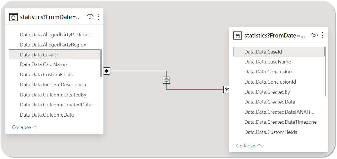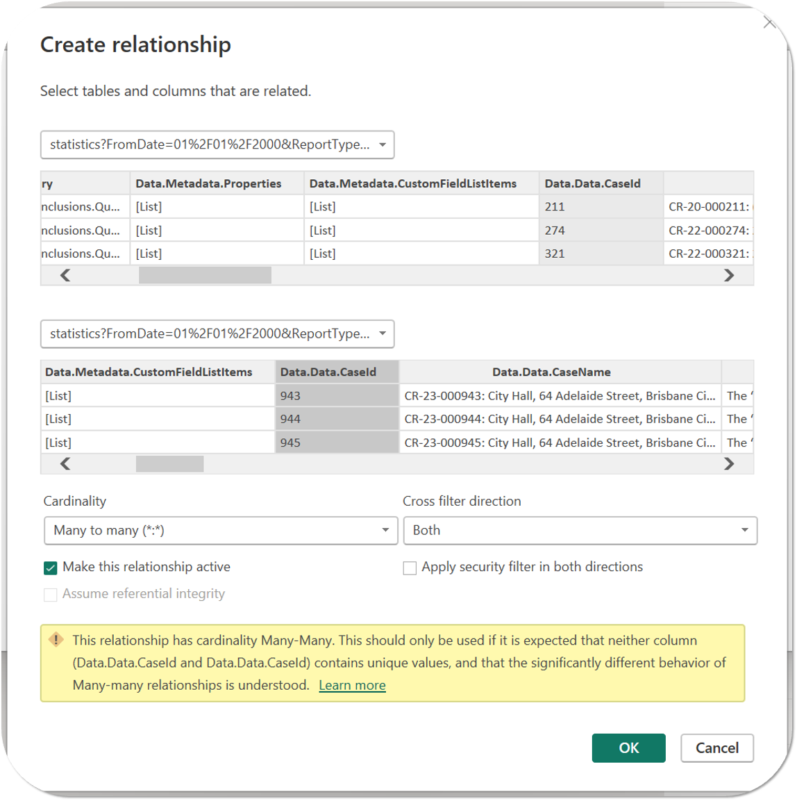 - In the Create Relationship pop-up, select two Comtrac Statistics Reports (i.e. Conclusions and Outcomes) in the drop-down fields and highlight the Caseid data column in each report to add a relationship between them. A mandatory many-to-many relationship will be automatically set in the cardinality field. Ensure the cross filter direction is also set to both.