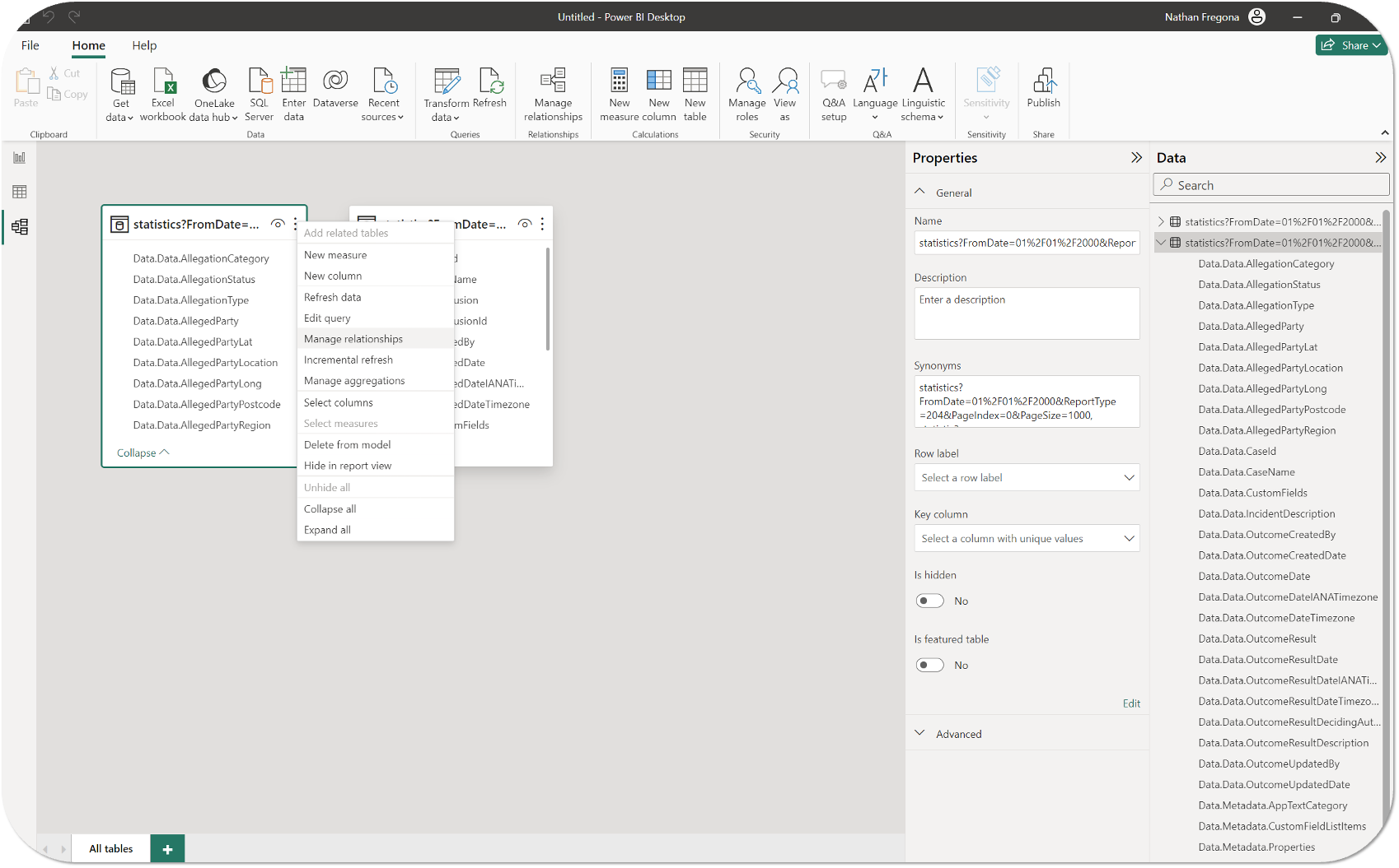 - Select OK to add the relationship to your Power BI report to beging building out visuals and templates. The relationship will appear similar to the below: